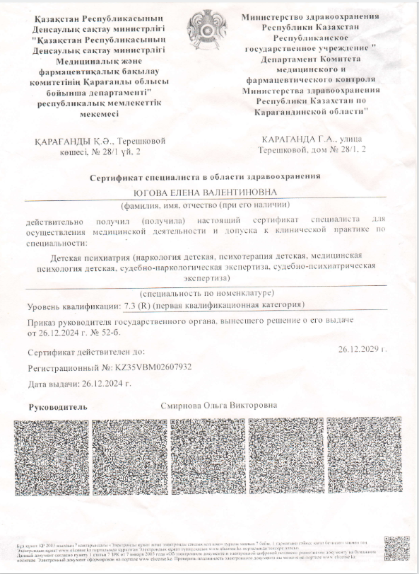 Югова Елена Валентиновна Врач-психиатр первой категории Образование высшее, КГМИ Достижения и награды